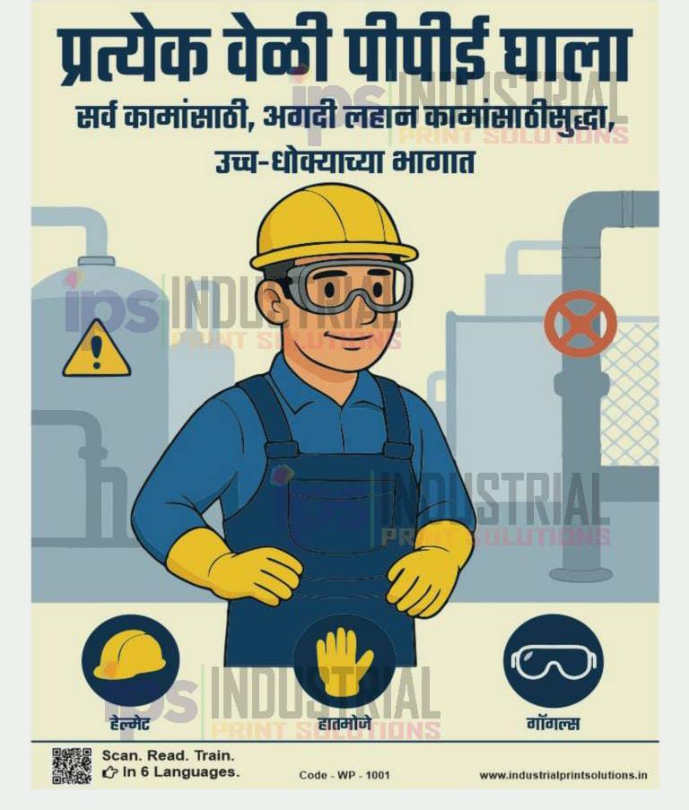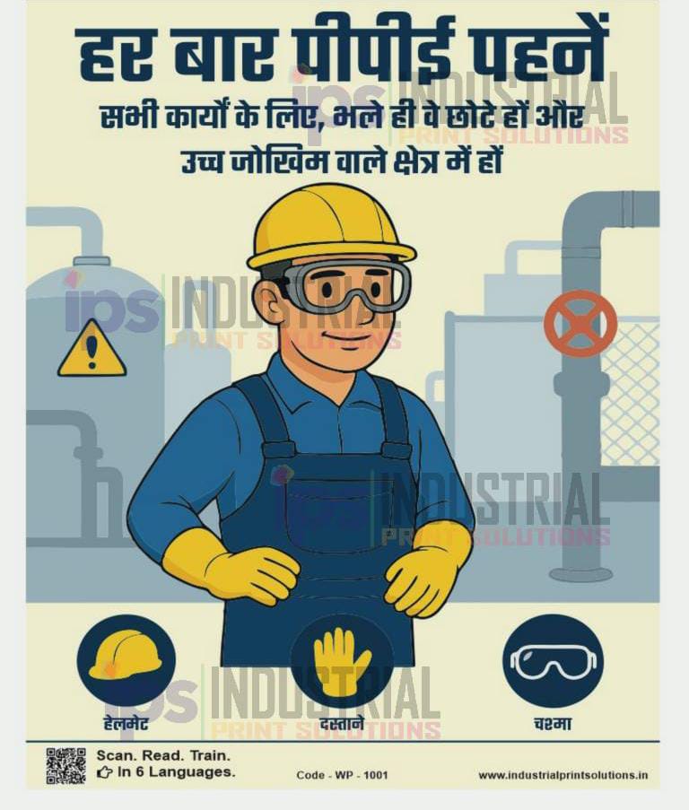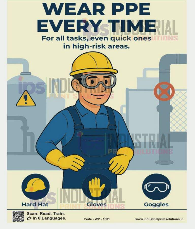 Always wear PPE before entering high-risk zones. This poster reminds all workers to use basic protective gear — helmet, gloves, and goggles — even for short tasks. Injuries can happen in seconds when safety is ignored. Wearing PPE is a simple step that prevents lifelong regret. 🟣 Action: Check your PPE before starting every job — no exceptions.